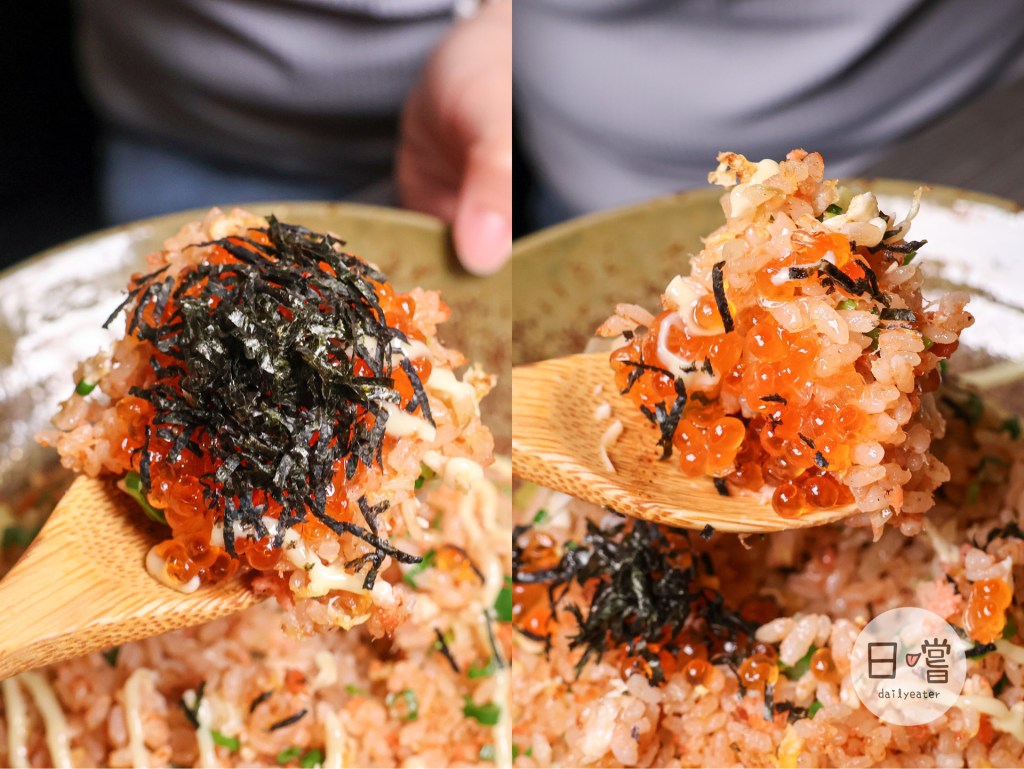 如果吃串燒、炸物不夠的話,日鶴也有提供主食的料理,像是炒飯跟烏龍麵!這道鮭魚親子炒飯就是用鮭魚下去炒後,在飯上放了滿滿的鮭魚卵,如此邪惡的組合能不愛嗎😂