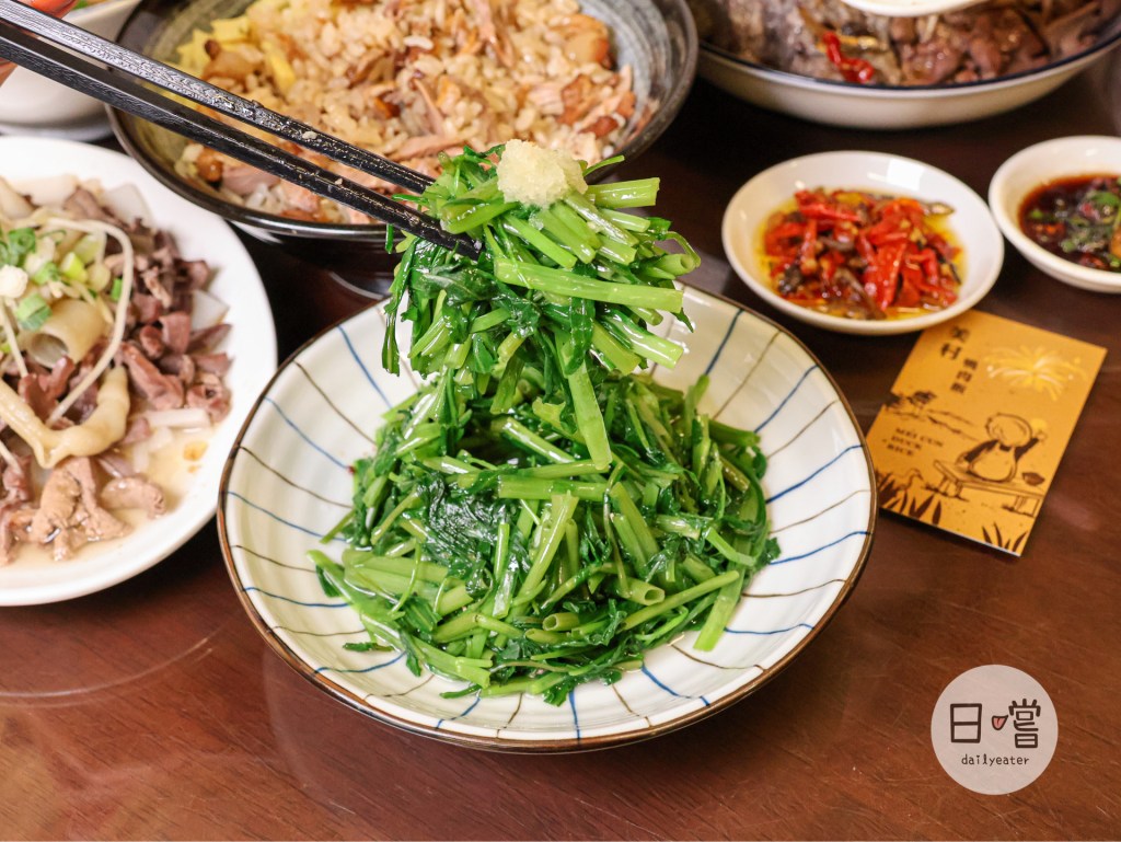 除了點飯、麵、鴨肉內臟類,當然也要來點蔬菜吧😎新鮮現燙的空心菜上面有蒜泥,鮮綠脆口點一盤配著吃也很不錯