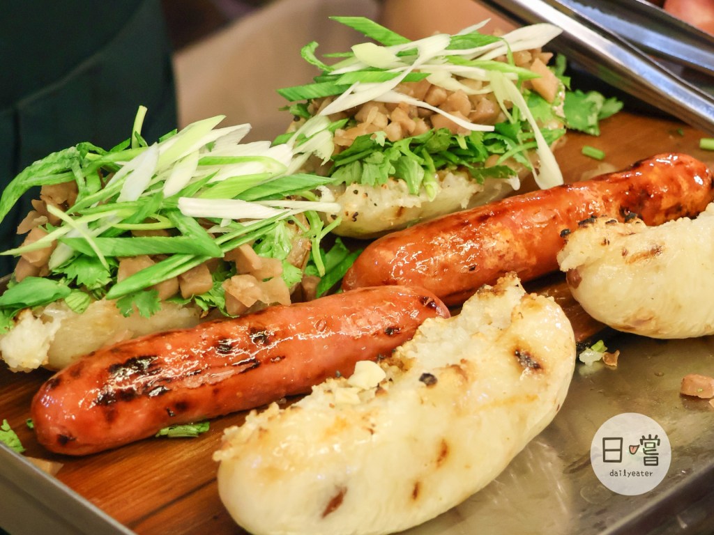 米腸上放的菜脯、香菜已經多到放不下香腸外,沒想到還有滿滿的蒜苗,這個爆餡的大腸包小腸吃一個絕對滿足到不行😂最後老闆怎麼把香腸放上去的?竟然是先把爆餡大腸放進去紙袋後再把香腸放進去,然後又多塞了幾樣配料🤤