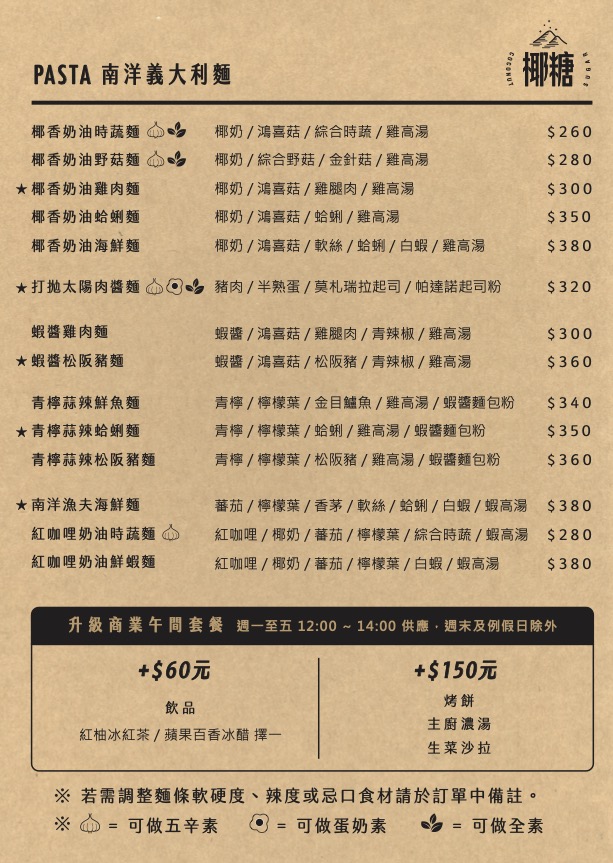椰糖的主食都是以義大利麵為主,選擇不同口味的義大利麵,它配的義大利麵條也不一樣!像是這道紅咖哩奶油鮮蝦麵就是使用了Casarecce(麻花麵),有問店家說能不能換其他麵,但因為每個醬汁所適合的麵條都不同,為了可以讓大家吃到最好吃的麵體就依照店家的安排!