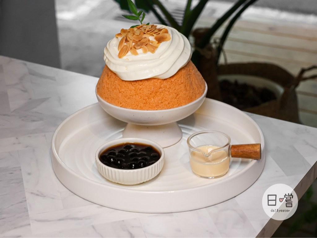 冰酥上會擠上一層鮮奶霜、撒杏仁片,旁邊還會附上黑糖珍珠跟煉乳!不過基本上已經滿甜的,但如果你是螞蟻人想吃更甜的話還是可以依照自己喜好添加
