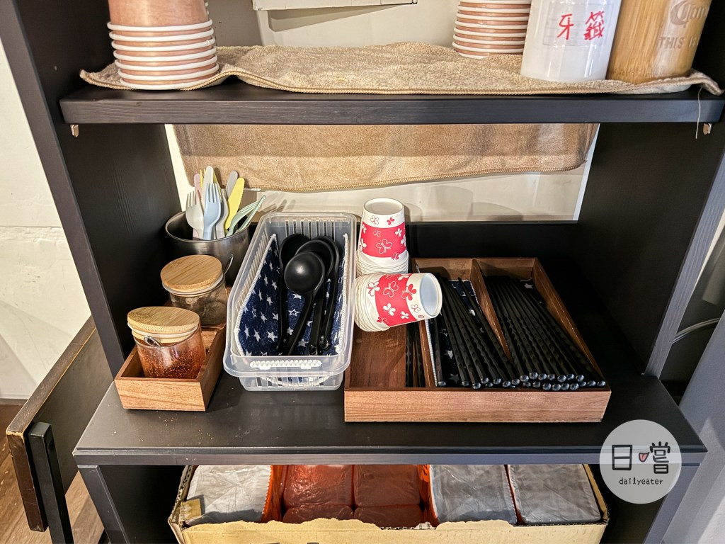 店內環境走得有點像居酒屋的感覺,餐廳門口有師傅在煮拉麵,而客人大多是坐在後面的區域!他們家是走自助式,餐具杯子都是自取,而吃完之後也記得要拿去後面的餐盤回收區