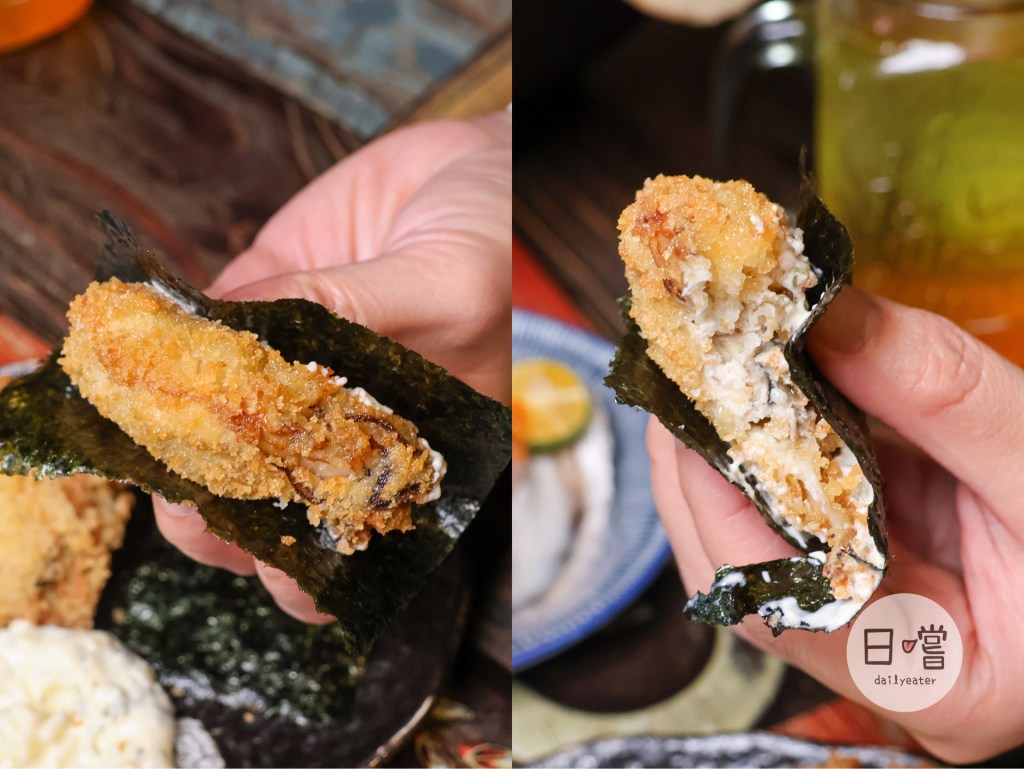 另一道炸牡蠣建議一上桌就要馬上吃,可以配著沾醬、海苔一口咬下去,酥脆的外皮裡面是厚實牡蠣肉😍搭配外面的海苔入口,相對於只有單純吃炸牡蠣要來得更不無聊!