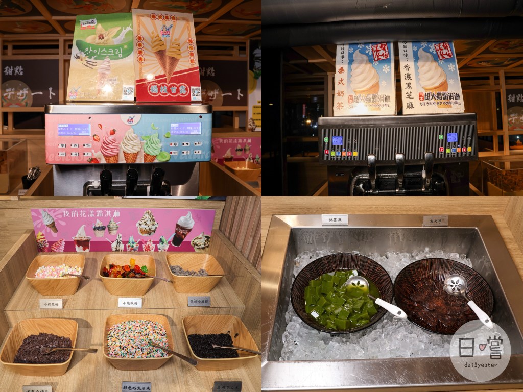 除了飲料也有甜點、霜淇淋自助區,在甜點的部分有抹茶凍、寒天凍可以讓你自己去搭配,還可以加小熊軟糖、小麻糬、小棉花糖等配料可以自己DIY!霜淇淋部分也有楊枝甘露、香草、黑芝麻跟泰奶口味,選擇可以說是相當的多😍