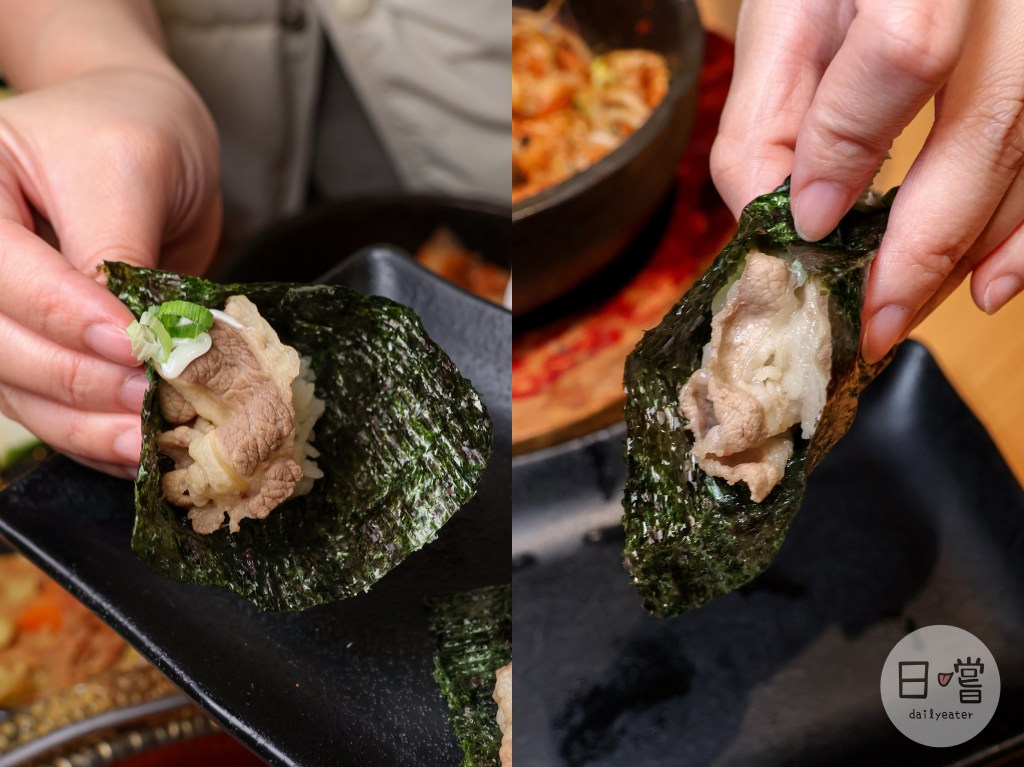 不管是哪種吃到飽方案,饗和牛都會有牛壽喜手卷、石鍋拌飯、手作海苔溫飯丸跟起司拉麵可以讓你無限吃!這道牛壽喜手卷一上桌可以看到有用海苔當底,建議一上桌就要趕快吃才不會讓海苔軟掉!入口除了可以吃到酥脆的海苔香再來就是富含油脂的牛壽司😍