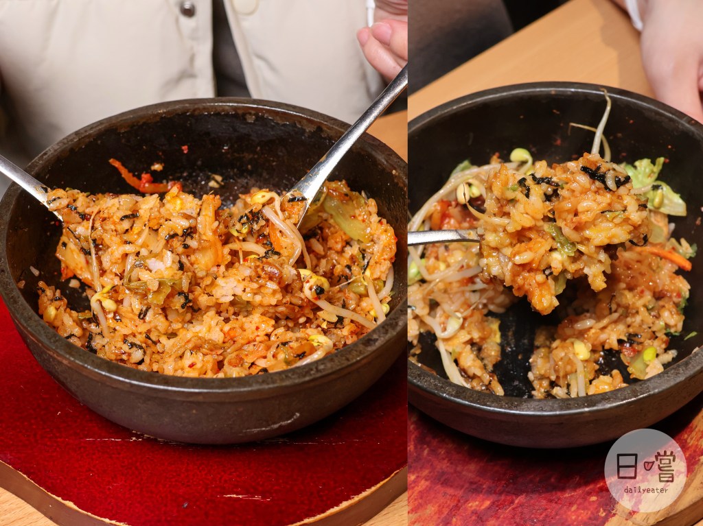 最讓我沒想到的是竟然連石鍋拌飯跟起司泡麵也有!加了泡菜、豆芽菜、生菜跟海苔絲,而且還有顆半熟蛋在上面也太邪惡了吧🤤上桌時就要趕快把飯跟上面的配料攪拌才會隨著石鍋的溫度產生鍋巴,拌在一起吃有焦脆的口感