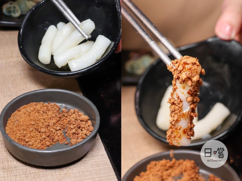 後來店員還給了我們一盤黑糖粉,說店內還有年糕跟麻糬燒可以下鍋煮,最後沾著黑糖粉吃也非常棒!跟朋友試了幾個之後真的是發現了另外一個天堂😂雖然鍋底是壽喜燒的湯頭,但其實沾附了黑糖粉完全都被蓋過去,吃到的是很濃的黑糖香!尤其麻糬燒裡面還有包著芝麻餡,在吃完一堆肉後來點不同的體驗真的是相當的新鮮👍🏼