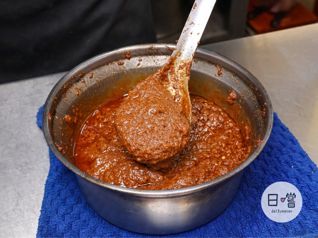 老闆純手工的花生豆瓣醬,可是他們家才有的獨門秘方!在醬中可以看到花生的碎粒,還沒有開始炒就可以聞到很香的氣味,而且還是跟沙茶那種鹹香完全不一樣