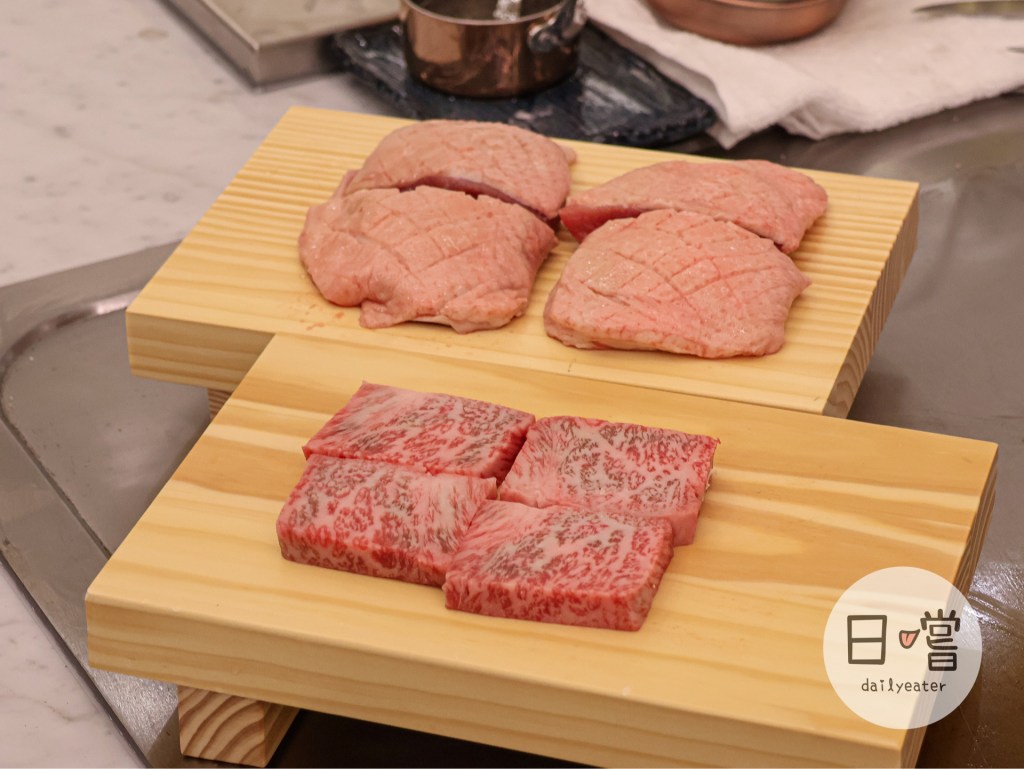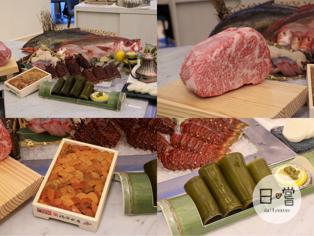 在料理前,師傅會先展示一下今天即將料理的食材。像是今天總共點了1600的樂饗宴跟2400的樂盛宴套餐,師傅會把今天所使用到的時令海鮮、海膽、鮑魚跟A5和牛拿出來給大家看