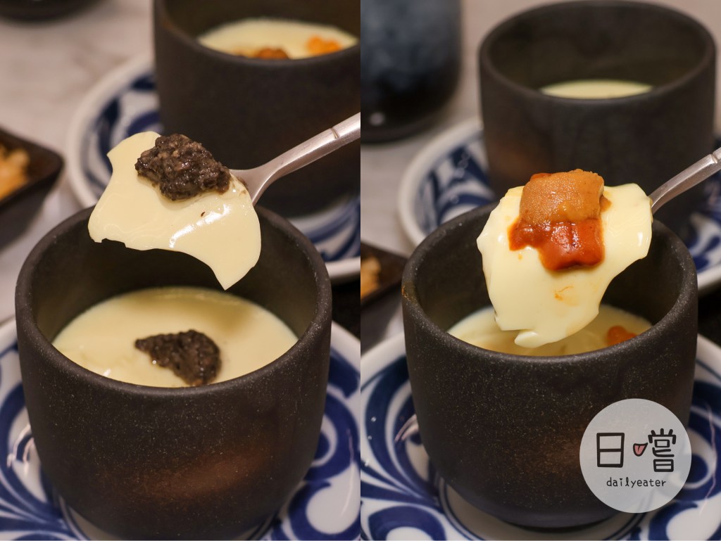 而熱前菜的話則會根據不同套餐給予不同的料理,樂饗宴給的松露蒸蛋可以吃到很濃郁的松露香搭配蒸蛋口感相當軟嫩;樂盛宴則是加了濃郁海膽的蒸蛋,海膽的鹹香嘴裡都是滿滿的鮮味