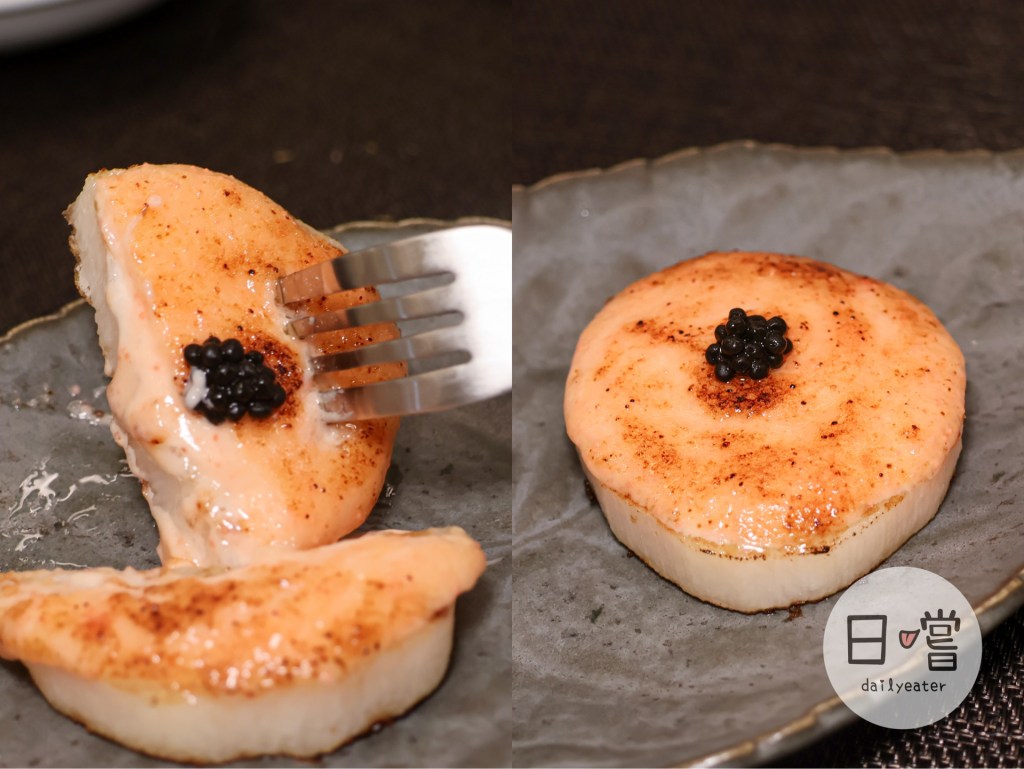 吃完第一道海鮮,接著就是樂饗宴跟樂盛宴都會吃到的北海道干貝!干貝被煎到大概五六分熟,過程中主廚並不會多加調味,在上面搭配比目魚鰭邊肉,最後再淋上鮭魚卵,鮮甜的滋味又多了點爆漿感相當有層次