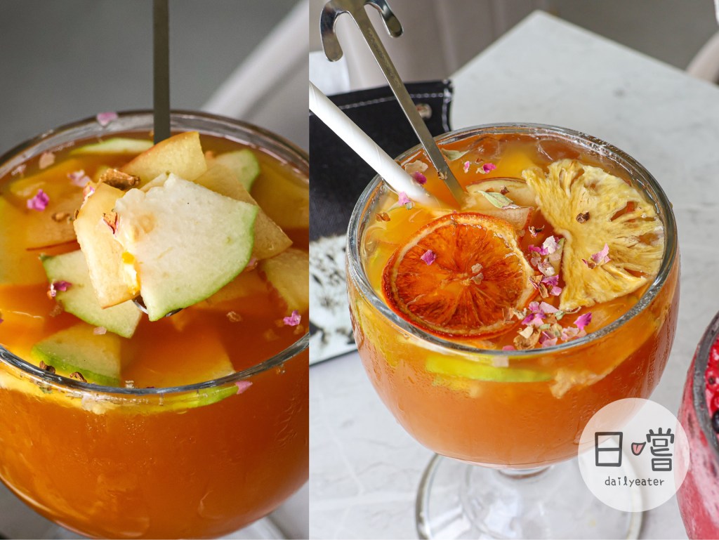 玫瑰水果茶用各式各樣新鮮水果製成,可以吃到芭樂、蘋果還有橘子,整杯都是水果自帶的甜味,還有美美的玫瑰花瓣,在吃了那麼多食物後來上一杯很解膩;而另一杯莓果氣泡飲則是在莓果冰沙中加了一些莓果類、波波球,口感超級豐富的😍