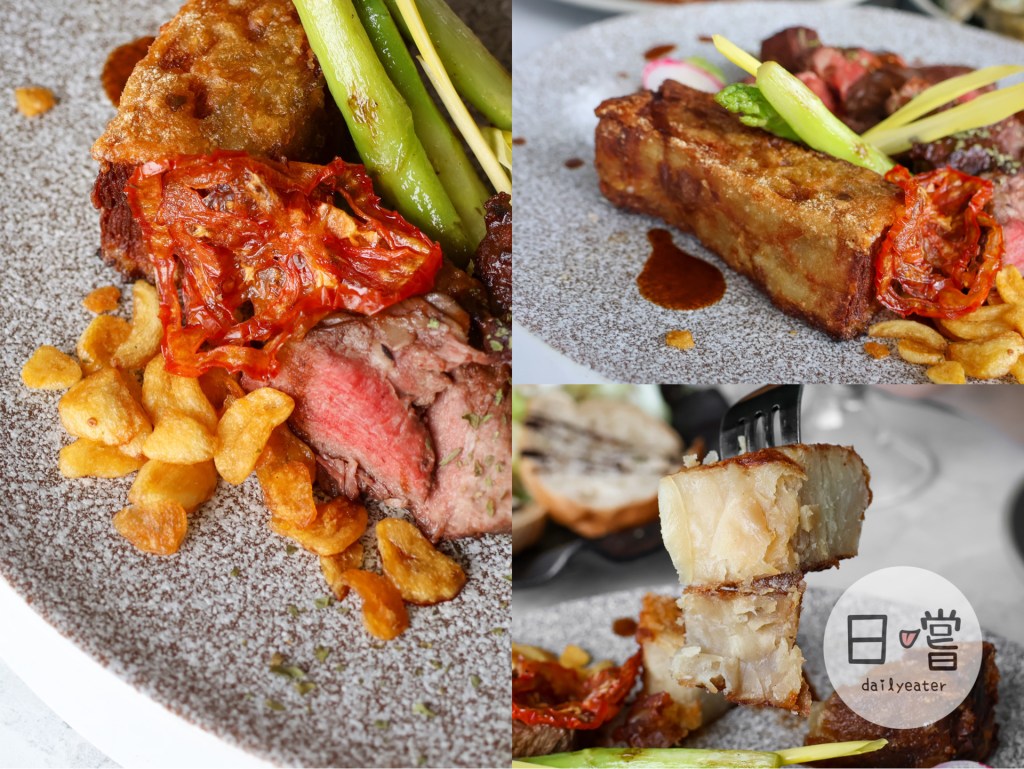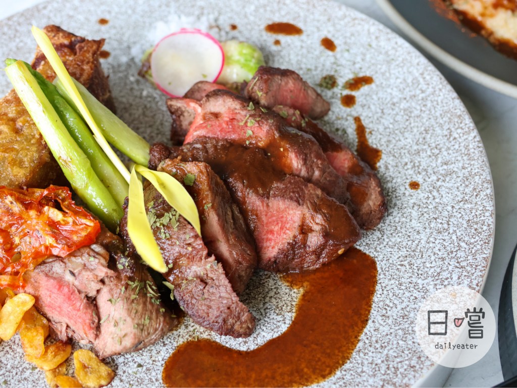 除了有牛板腱外,旁邊還有蒜片、薯塊,還會灑上一些鹽。如果覺得單吃無聊的話,還可以搭配來吃!雖然是景觀餐廳,但貓禾咖啡裡的排餐也完全不會輸專門料理排餐的店呢!