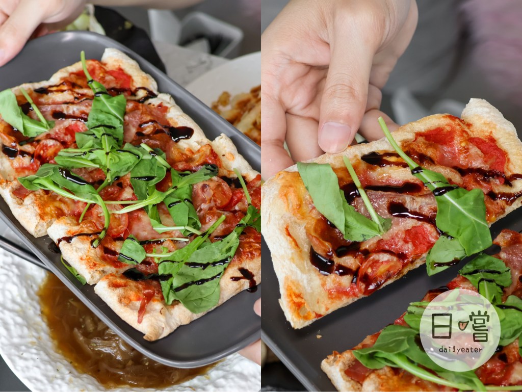 別於吃到的圓形披薩,貓禾咖啡的PIZZA竟然是長方形的!以帶有酸甜的番茄為底,上面除了有生火腿外,還灑了滿滿的芝麻葉😍要吃的時候可以把PIZZA捲成捲餅的方式,料比較不會掉出來,也比較好入口喔!
