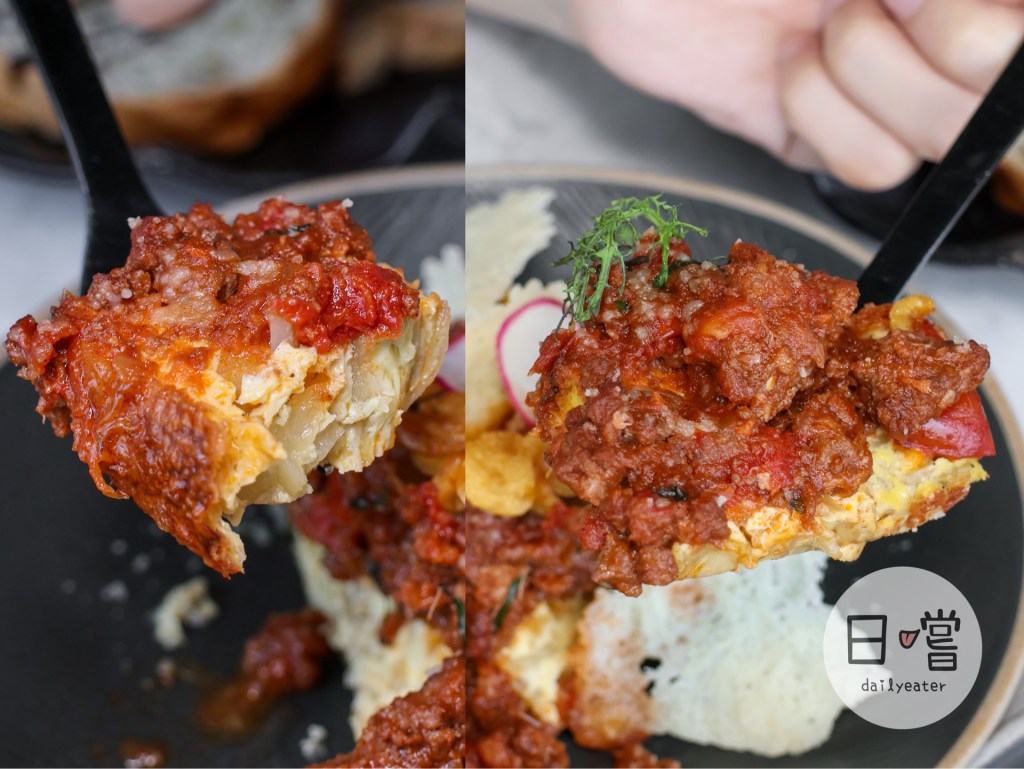這道波隆那肉醬烘蛋算是走特色路線,烘蛋比較偏西班牙烘蛋的感覺,上方酸酸甜甜肉醬搭起來絕配!除此之外,米白色薄片餅乾可當裝飾,跟烘蛋一起吃下去脆脆的口感可以增添層次