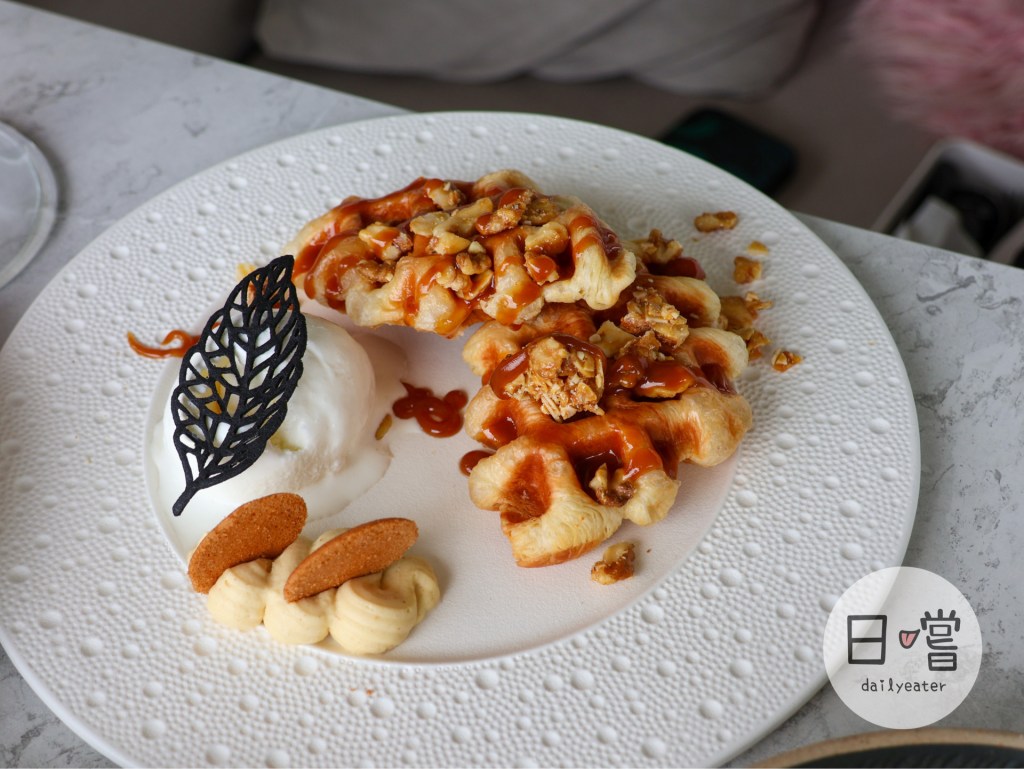 一上桌可以看到漂亮的擺盤,酥脆的可朗芙上面有黑糖、堅果,口感可以說是相當豐富!單就可朗芙來說,有著鬆餅的外型但口感又像可頌一樣酥香,實在是相當的好吃😍夏天很適合搭配冰淇淋,冰火五重天的感覺讓人意猶未盡呢