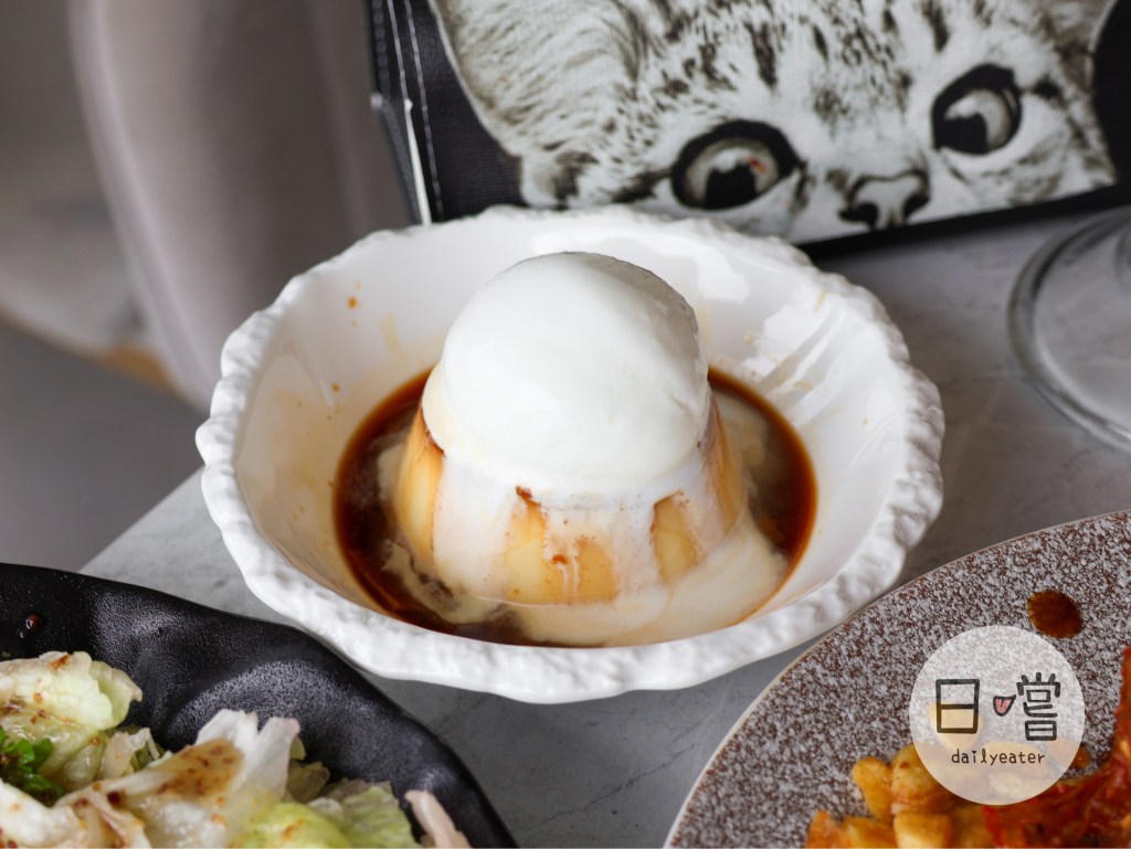 在貓禾咖啡除了可以點可朗芙鬆餅,還有蛋糕、甜塔、法式吐司等,可以選擇的甜點也相當的豐富!朋友點的另一道焦糖烤布丁,沒想到在布丁上直接放一球冰淇淋要多邪惡啦😍