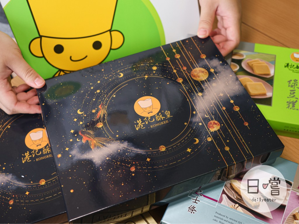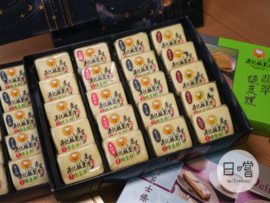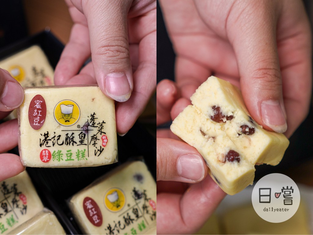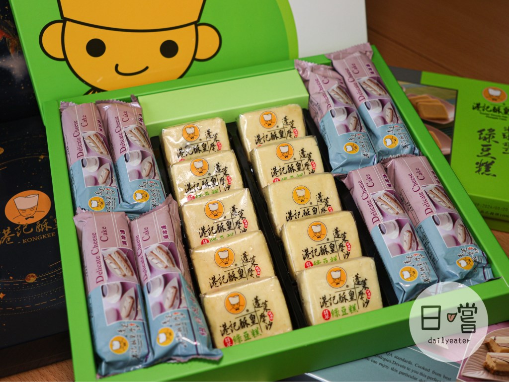 提到港記酥皇,除了有前面的總統餅、芝士乳酪條,這款綠豆糕也是熱銷產品之一!日月星辰禮盒裡主要是以原味、黑芝麻、蜜紅豆跟蔓越莓綠豆糕四種口味的綜合版本!