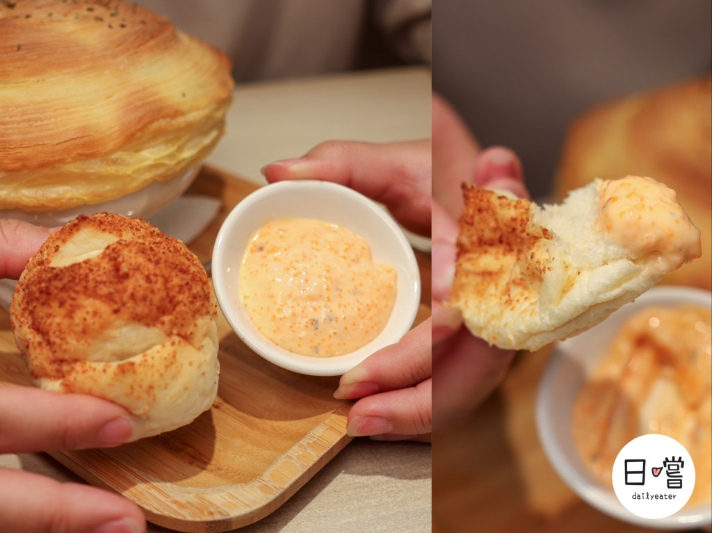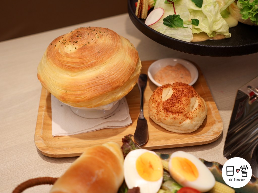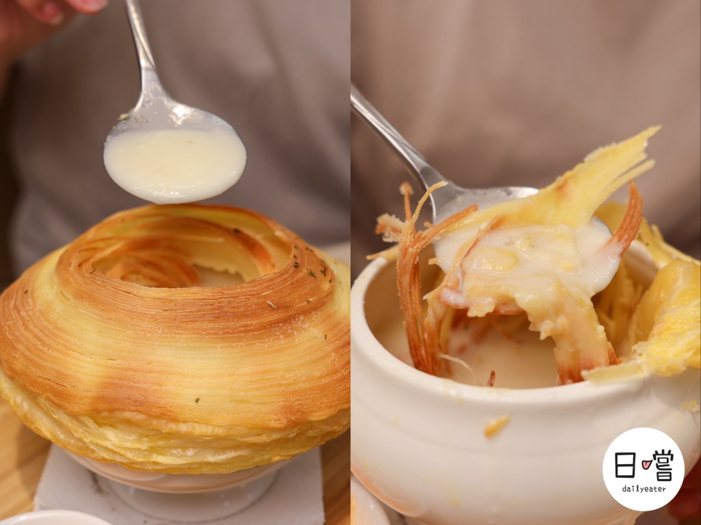 而這道酥皮濃湯是外面比較少見的螺旋酥皮,整個酥度就是跟一般方形酥皮不在同一個檔次😂搭配麵包跟明太子醬表現真的不在話下欸!