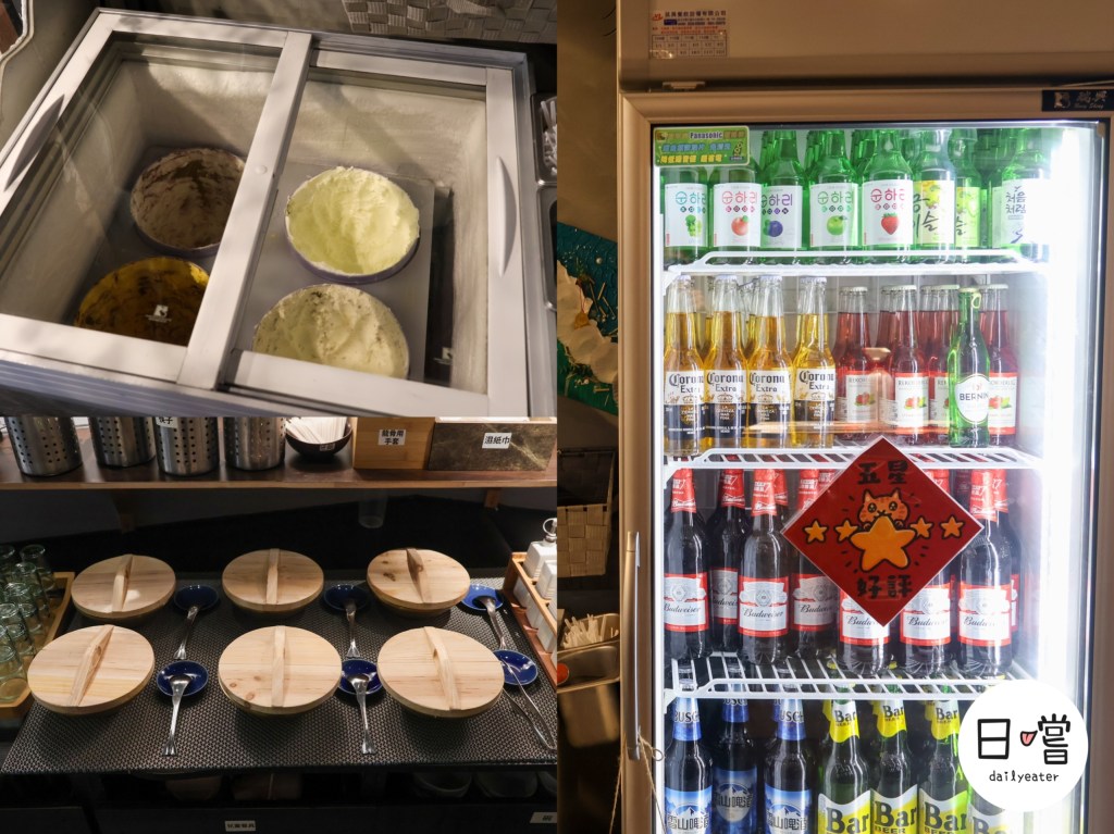 冰淇淋櫃跟飲品冰箱;調味料台、餐具、白飯通通集中在一起,不僅動線清楚、取用方便,而且整潔度也維持得很不錯,吃得開心、動線順暢。