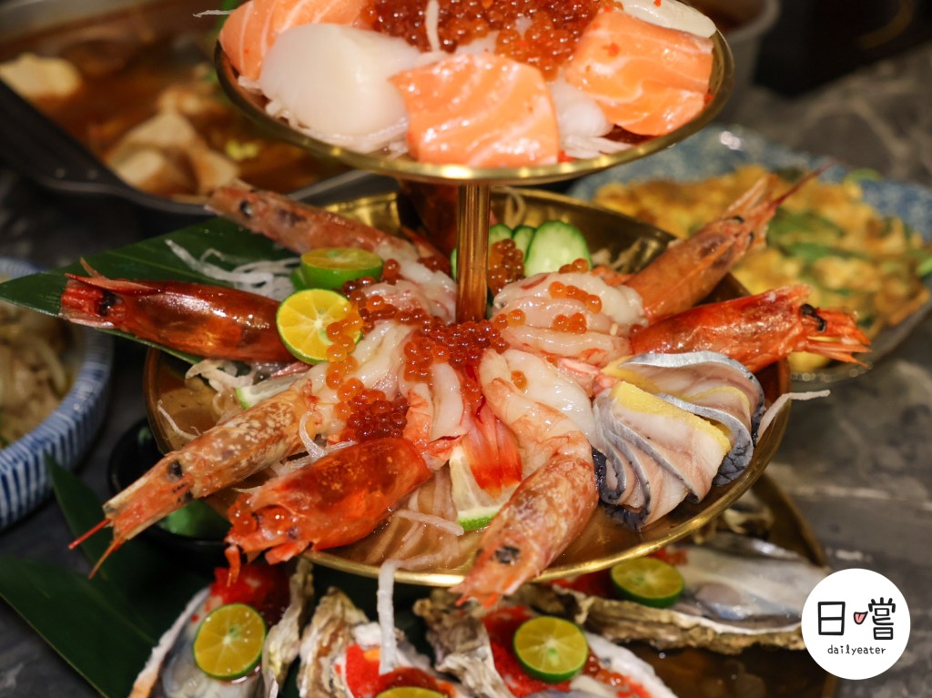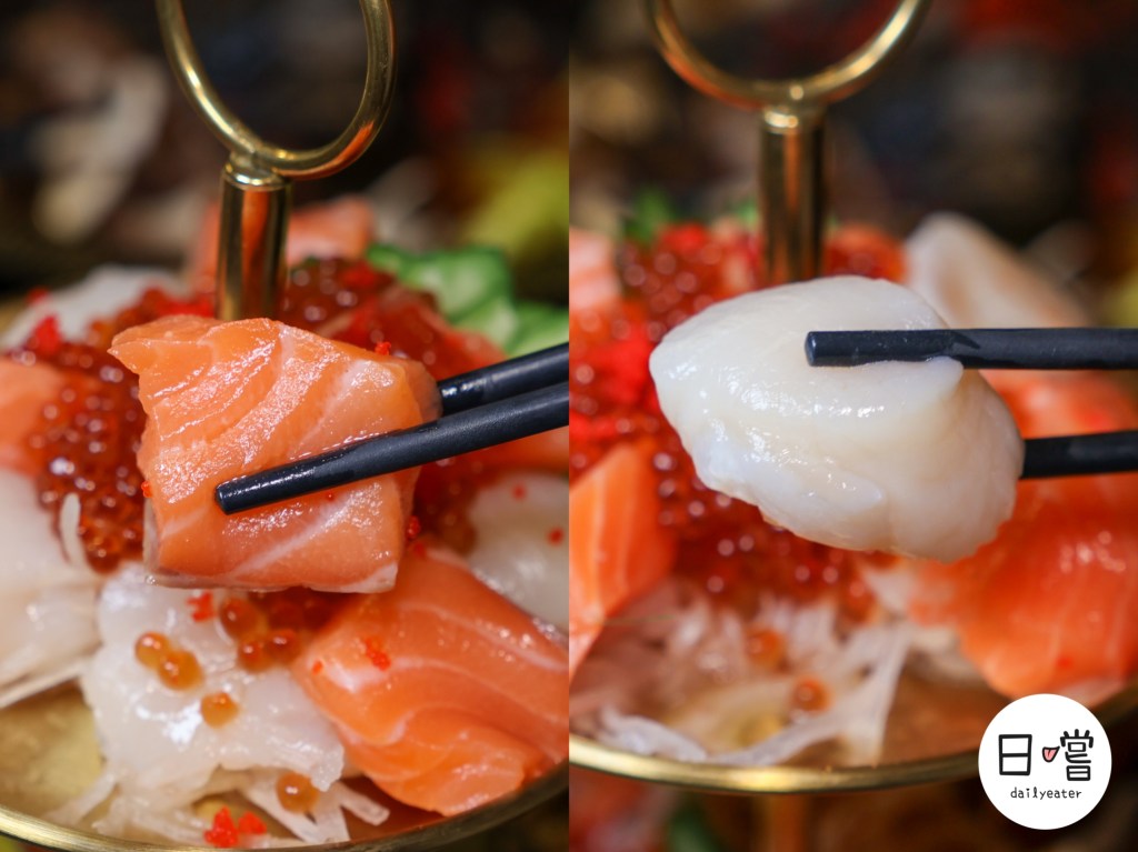 一上桌直接讓人倒抽一口氣,這座三層金色海鮮塔,根本是把漁港搬進店裡!最上層是鮭魚、干貝、生魚片與滿滿鮭魚卵,配上小黃瓜點綴,顏色鮮明、擺盤漂亮,每一片生魚片都透亮細緻,油脂豐潤得像在吃高級丼飯的主角級食材。干貝厚實飽滿,吃起來超甜超滑口,完全沒有腥味。