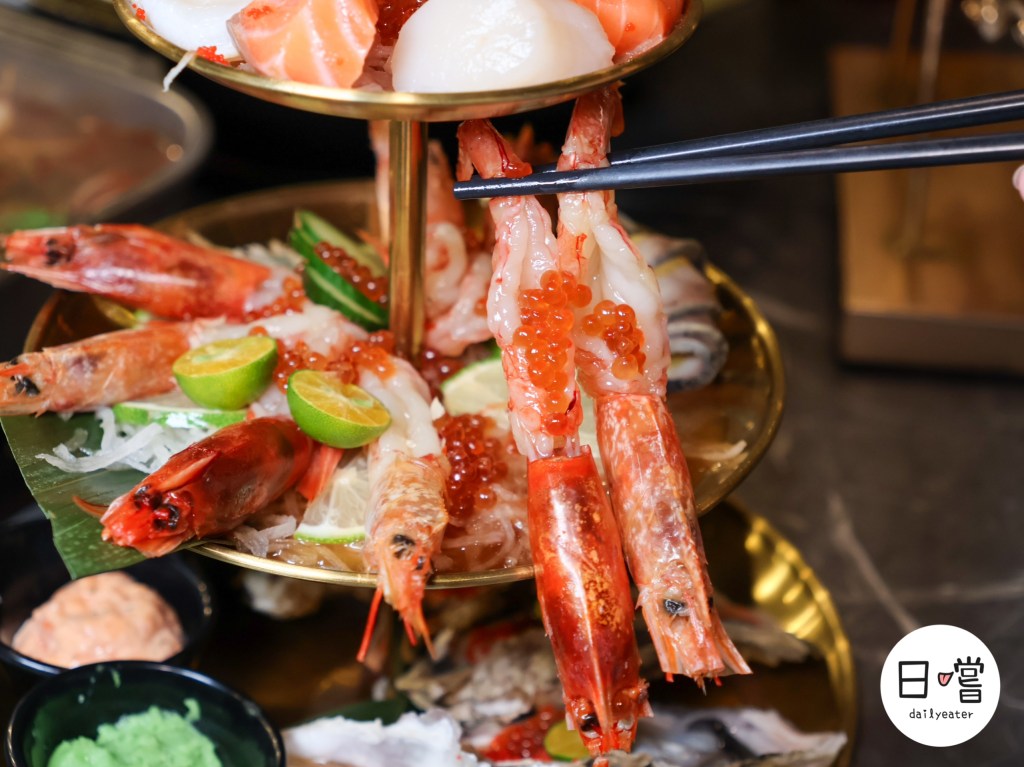 第二層是蝦子的天下,有鮮蝦一字排開,蝦肉緊實又新鮮,蝦頭裡的蝦膏濃郁到不行,再搭配幾片切片魚卷與鮭魚卵,視覺跟口感都超有層次。