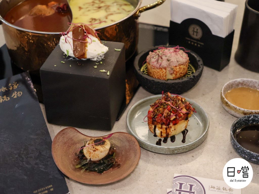 火火乳酪烏魚子這道更是亮點,濃郁香滑的乳酪抹成球狀,上面疊著厚切炙烤烏魚子,一口咬下層次爆炸,鹹香奶韻與果酸微甜完美平衡,完全不像是你在火鍋店會吃到的前菜。