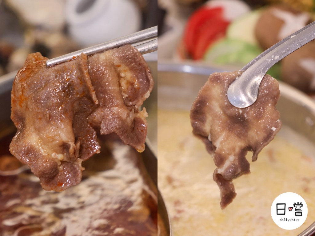 牛舌芯取自舌根部位,是整條牛舌中最柔嫩的精華。麻辣湯涮過一輪,肉香更被激發,帶點辣油包覆更有層次;若喜歡溫潤清爽的版本,放入黃金蟲草燕麥奶鍋則是另一種柔滑細膩的享受,兩種湯底都超合拍,完全吃不膩!
