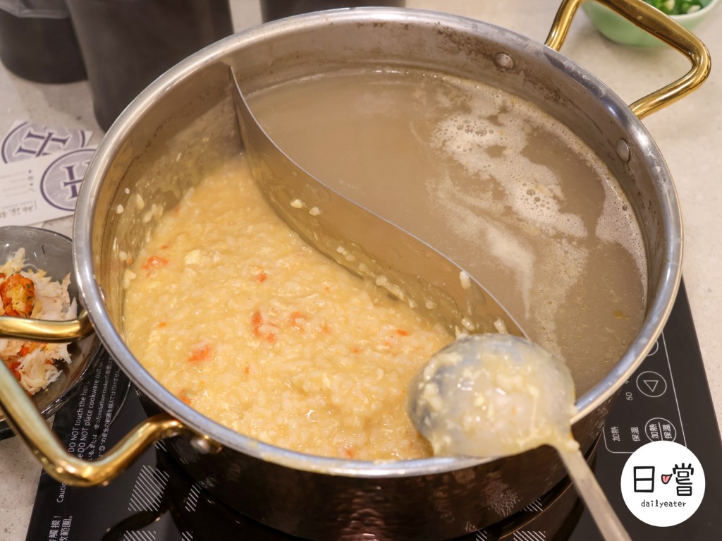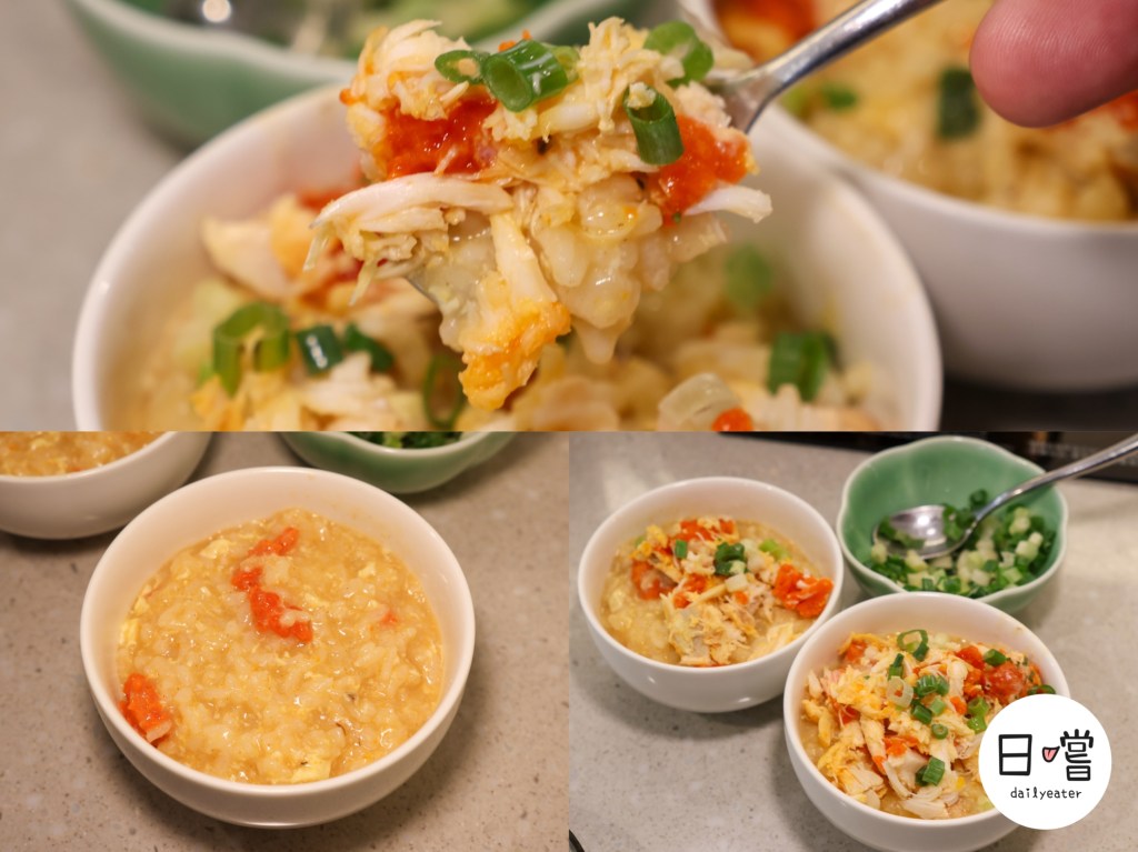 湯底吸滿海味精華,加入打蛋與米飯慢熬,最後撒上蔥花、放入蟹肉蟹膏——完美收尾、暖心又暖胃。這鍋粥真的太犯規,不小心會把一整鍋吃光光!