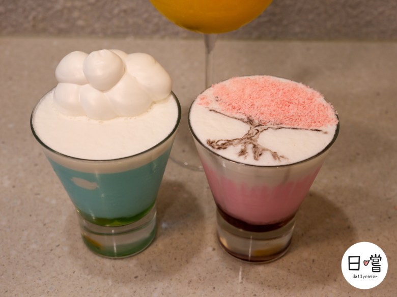 一上桌就讓人忍不住拿起手機拍不停的,就是這兩杯超夢幻飲料「雲層下的秘密」與「櫻你莓好」,每杯都是視覺系的代表作。