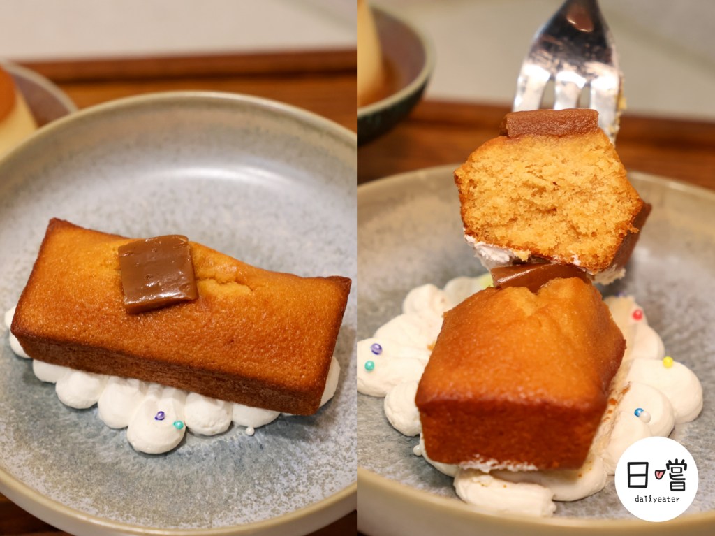 切開來,費南雪的蛋糕體非常濕潤綿密,咬下去的瞬間可以感受到奶油香氣和太妃糖的焦甜交織,整體口感紮實又不膩。搭配一口熱茶或是剛剛點的夢幻特調飲品,完美畫下甜甜的句點。