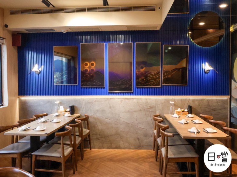 走上二樓,空間更為寬敞明亮,大片落地窗灑進自然光,搭配深藍色藝術牆與柔和燈帶,營造出既典雅又時髦的氛圍。桌距寬敞,座位數多,還有適合六至八人的大桌,非常適合家庭聚餐或朋友慶生。牆面上的藝術掛畫和細膩燈光設計,為空間增添一絲現代感,也讓用餐體驗更顯高級。