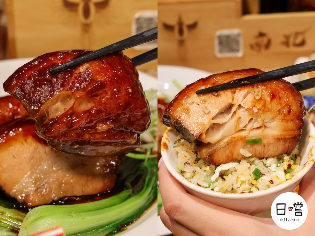 搭配底層的青江菜,爽脆清甜恰好平衡了肉的濃郁,再把東坡肉疊在炒飯上一起入口,鹹香醬汁與粒粒分明的米飯交織,層次直接拉滿!濃厚的醬香裡帶著微微的甘甜,讓人不知不覺就一口接一口。這道料理不只是視覺享受,還是味蕾的奢華饗宴,無論單吃或拌飯都極度滿足。