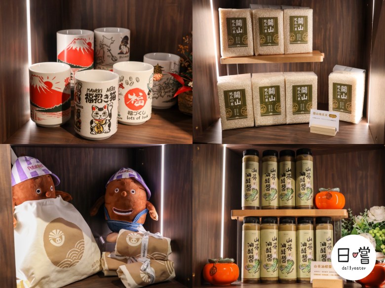 他們還有販售超多可愛周邊!像是日本風格的陶杯、印有LOGO的帆布袋、關山米與山葵油醋醬,不只好拍也很實用,特別適合喜歡收藏品牌小物的人。