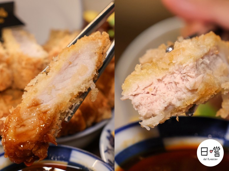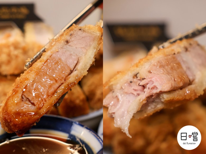 相比之下,梅花豬的油花明顯豐富許多,橫切面還透著粉嫩光澤,一口咬下柔嫩多汁,油脂的香氣在嘴裡蔓延開來,完全不會膩口,也沒有什麼油耗味,反而有種入口即化的錯覺。炸衣吸附肉汁,每一口都令人回味。