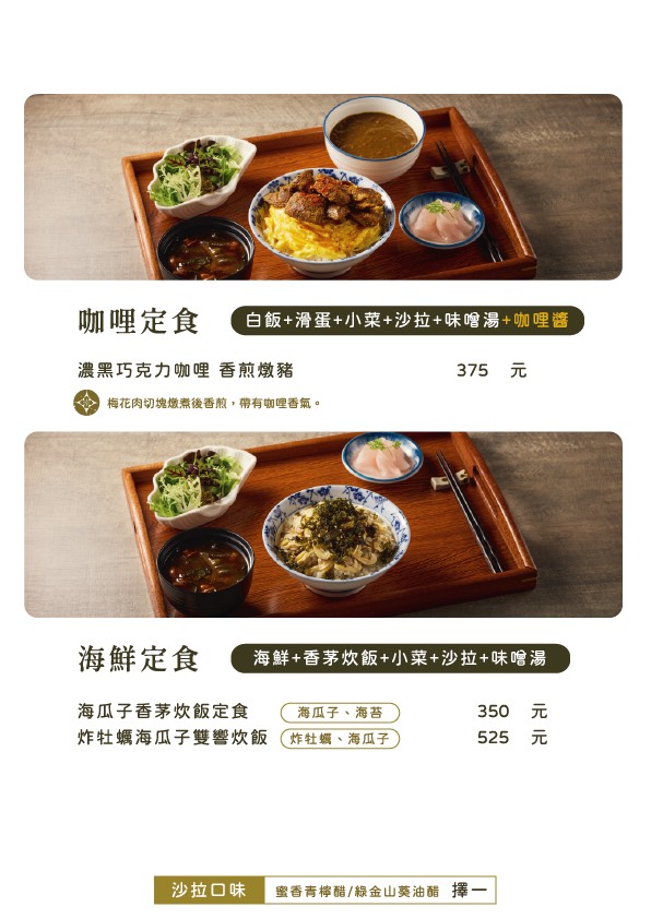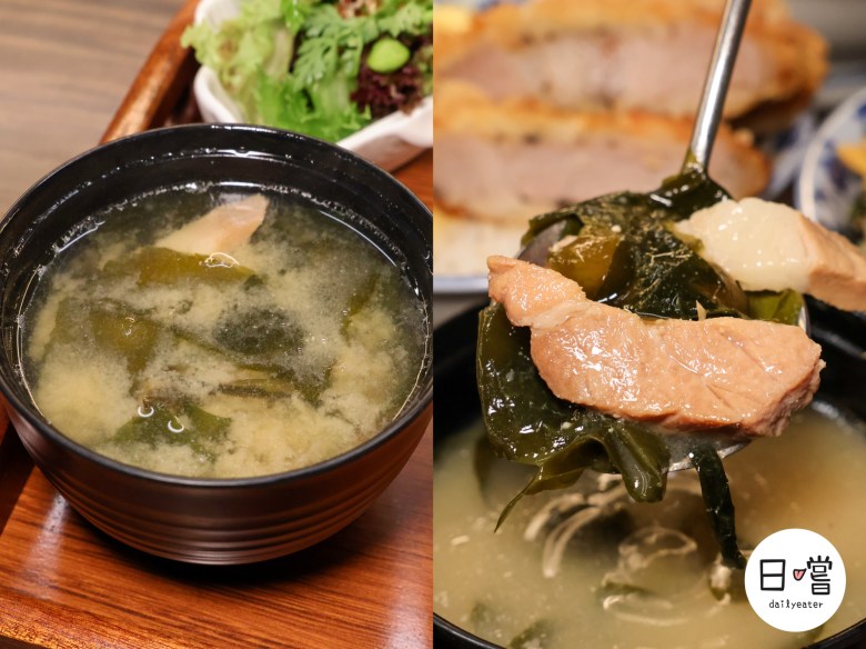 不只主餐強,套餐內容也誠意十足!附餐有風味沙拉(醬料還能自選蜜香青檸醋或綠金山葵油醋),還有溫潤的味噌鮭魚湯與解膩漬物,吃完完全不空虛。視覺也講究,木盤托餐呈現得像日式定食一樣乾淨舒服,整套吃下來超有飽足感還很療癒。
