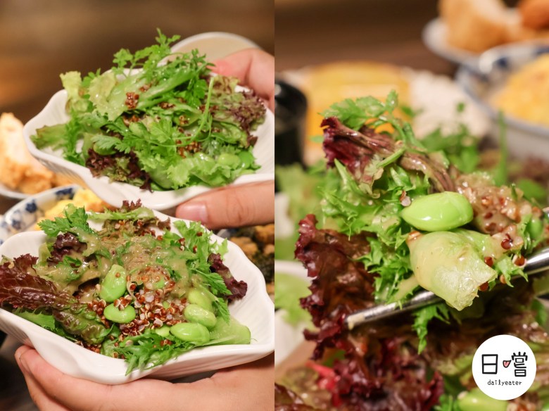 這份套餐的附餐也非常有誠意。沙拉用的是多種生菜搭配毛豆與藜麥,份量十足,醬汁還能自選,有蜜香青檸醋和綠金山葵油醋兩種,我自己特別喜歡山葵口味,微嗆開胃又不搶味。