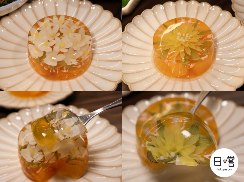 這份手工果凍花根本就是藝術品!一端上桌就讓人驚呼連連,整顆晶瑩剔透,花瓣層層堆疊得立體又細緻,白花清新、黃花亮眼,像是被封存進果凍裡的春日花園。