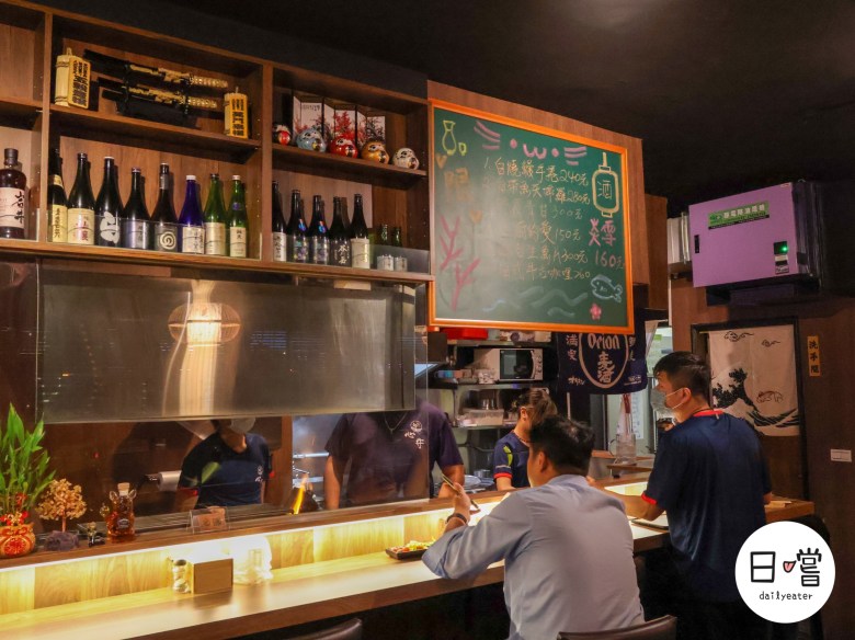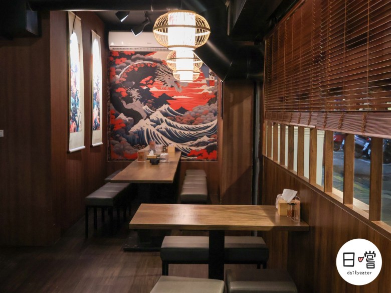 店內以深色木質調為主,搭配暖黃燈光與拉門設計,營造出靜謐又放鬆的空間。靠牆座位寬敞舒適,非常適合兩三人聚餐,而吧檯座位則能近距離欣賞師傅烤串與料理的過程,感受居酒屋熱鬧的靈魂氣氛。牆面上掛有黑板菜單,會隨季節或主廚心情推出限定料理,每次來都有不同驚喜。