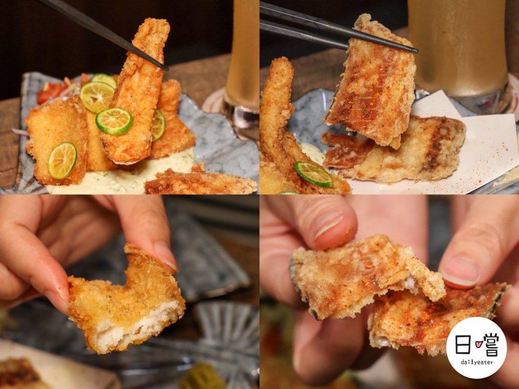 這道是「白帶魚天婦羅」是他們黑板上的特別料理,店家將魚肉與魚骨分開製作,讓口感層次更豐富。魚肉外層炸得金黃酥脆,咬下去能感受到細嫩的魚肉在嘴裡化開;魚骨則炸得香脆帶鹹香,越嚼越香。