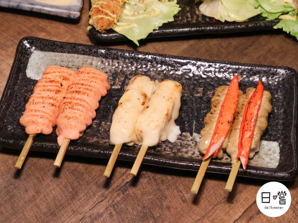 右邊的蟹膏雞肉串上鋪滿蟹味棒與蟹膏,入口濃郁鮮香,結合雞肉的多汁口感,帶出滿滿海味,是喜歡重口味的必點選項。