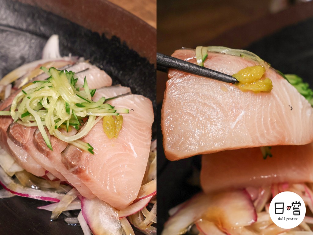 油脂豐厚的青甘魚肉切得厚實飽滿,入口柔嫩細緻,帶著自然的海味。外層炙燒得微焦,鎖住魚肉鮮甜的同時還多了層香氣。上頭鋪上細絲小黃瓜絲,清爽脆口,完美平衡魚肉的油潤感。