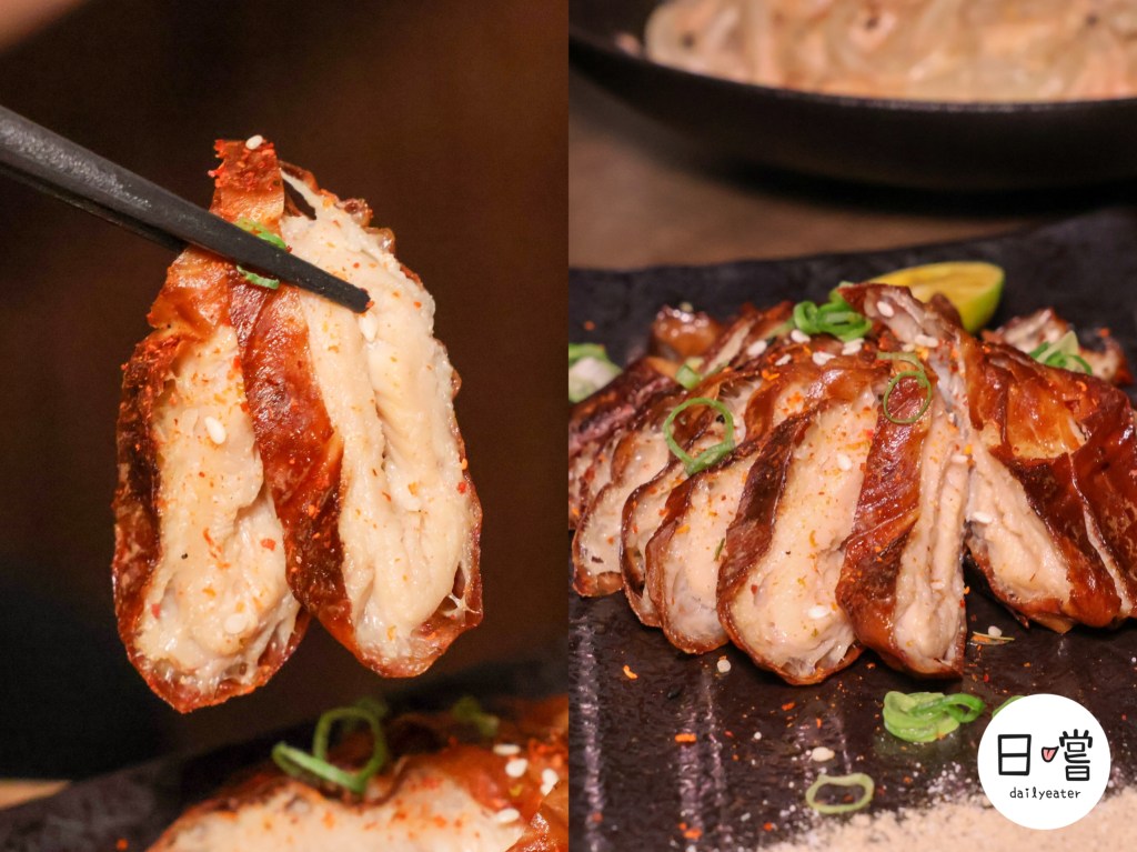 搭配一旁的柚子胡椒醬與柚子胡椒鹽,可以自由變換風味。柚子胡椒醬帶點微辣清香、柚子胡椒鹽則清爽提味,每一口都能嚐到不同層次。整體香氣迷人又不油膩,是非常適合搭配啤酒的小食。