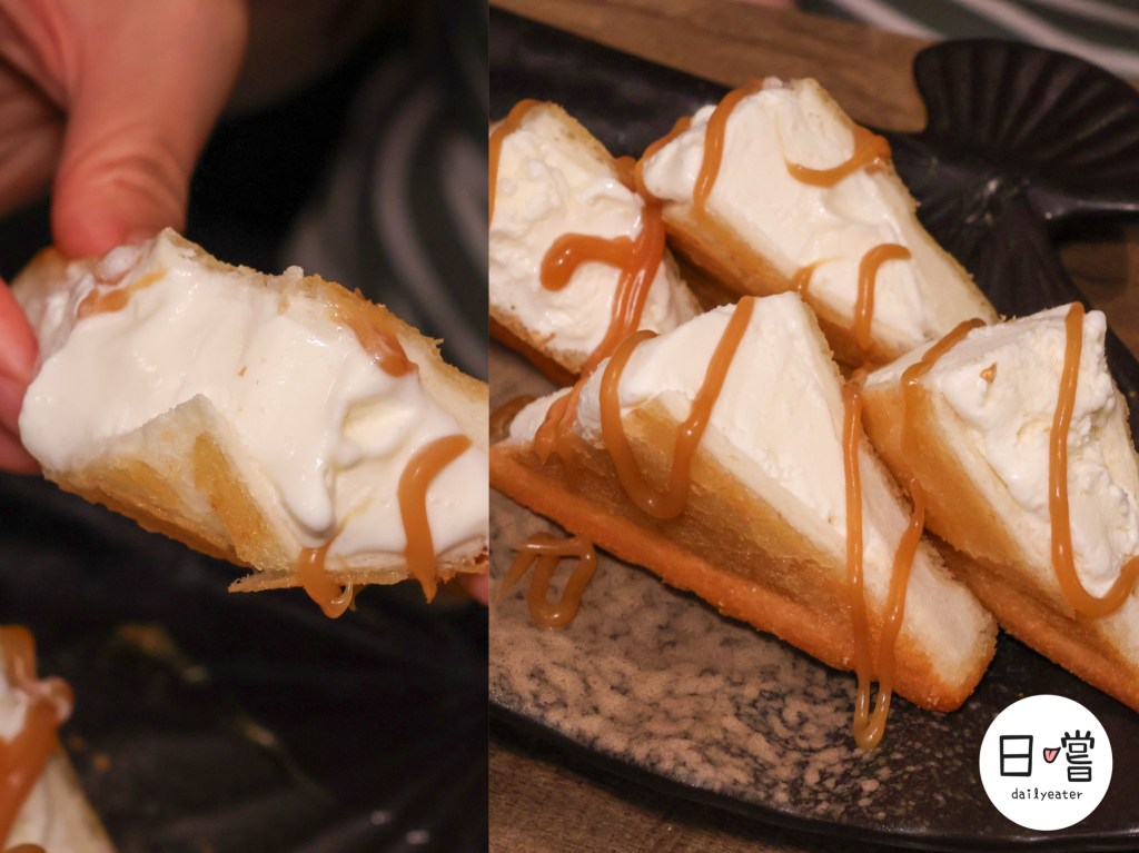 但你以為就這樣結束了嗎?這道炎雪冰淇淋才是最棒的收尾。外層是香酥熱烤吐司,裡面包著冰涼綿密的冰淇淋,冷熱交織的口感在嘴裡瞬間化開。上層再淋上濃郁焦糖醬,帶出微苦香氣與甜味層次,每一口都療癒。外脆內滑、冰火交融,是餐後最完美的收尾甜點。