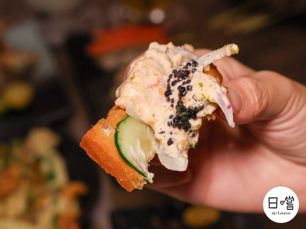 一口咬下,酥脆的麵包與滑順的醬料交織出豐富層次,魚子醬在舌尖輕輕爆開,鹹香風味讓整體更有深度。小黃瓜與洋蔥帶來清爽感,平衡了濃郁的沙拉,吃起來不膩口。