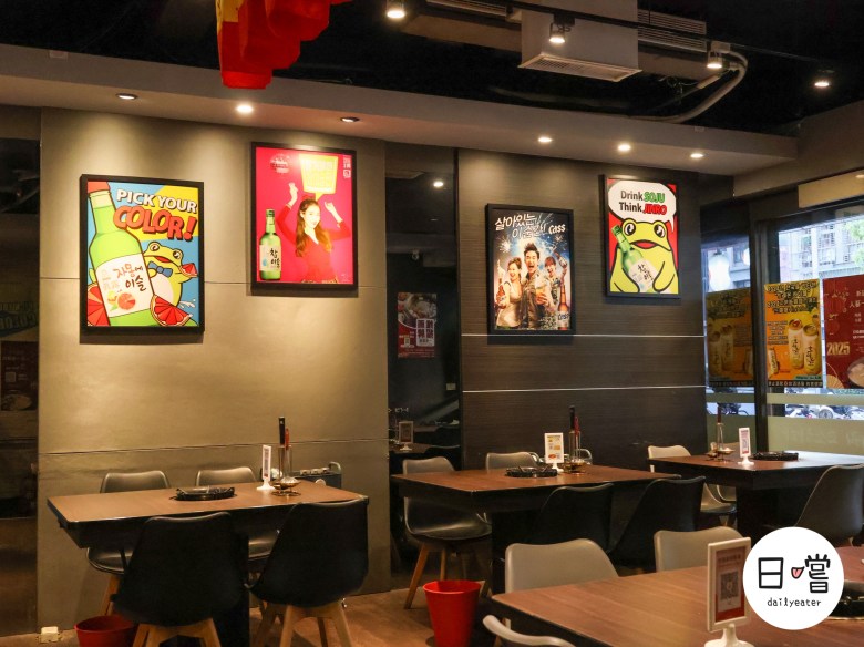 推開門的瞬間,氣氛更是直接轉換成韓國弘大的夜晚。牆上掛著真露青蛙、燒酒廣告海報與鮮豔的插畫牆,整間店充滿歡樂感與年輕氣息。牆上還掛著韓式調酒教學,看著海報上各種燒酒、啤酒和果汁混搭比例,讓人不自覺就想點上一杯來試試。