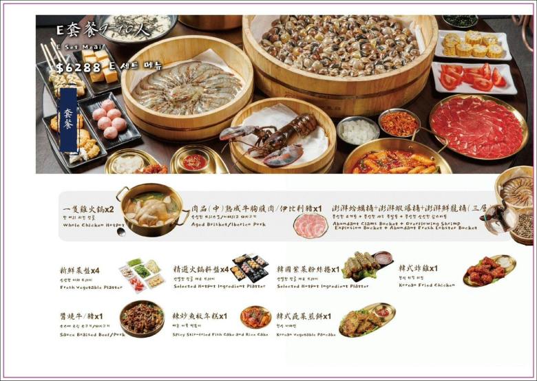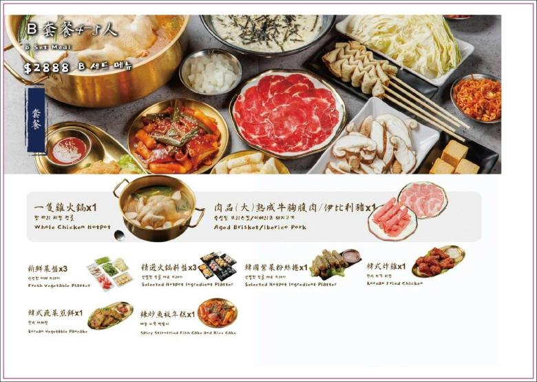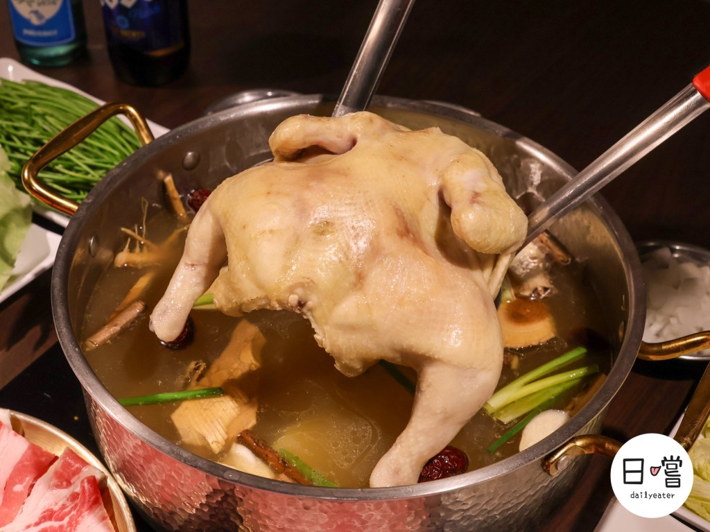 餐點部分主打「一隻雞鍋」,整隻雞搭配人蔘、紅棗、蒜頭等藥材熬煮,湯頭濃郁又帶自然甘味,雞肉燉得軟嫩入味。想要更豐富一點,還能加點西班牙伊比利豬、熟成牛胸腹肉等肉盤,肉質油花漂亮、涮起來香氣十足,配上自助冰箱裡滿滿的蔬菜與火鍋料,吃得超滿足。