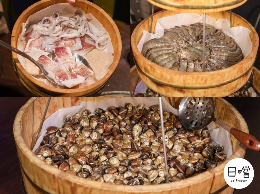 澎湃三鮮桶一上桌就超吸睛!三層木桶堆疊的氣勢滿滿,最底層是滿滿蛤蜊,中層是肥美白蝦,最上層則是新鮮透抽,一次滿足海鮮控的所有願望。(其他還有帝王蟹、魚片等,可以根據金額跟需求客製化)