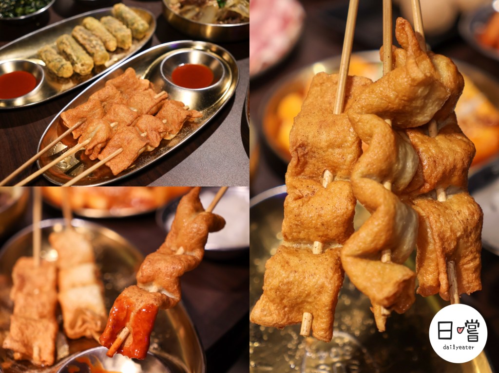 這裡的火鍋料區也很特別,採用自助取餐方式,讓人有種在韓國小火鍋店挑料的樂趣。冰箱裡整齊擺放著各式蔬菜、魚丸、豆皮、甜不辣、蟹肉棒等選項,光是配料就能挑好久。