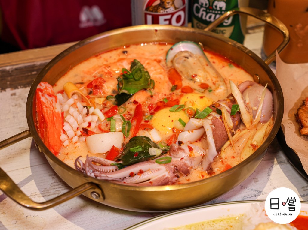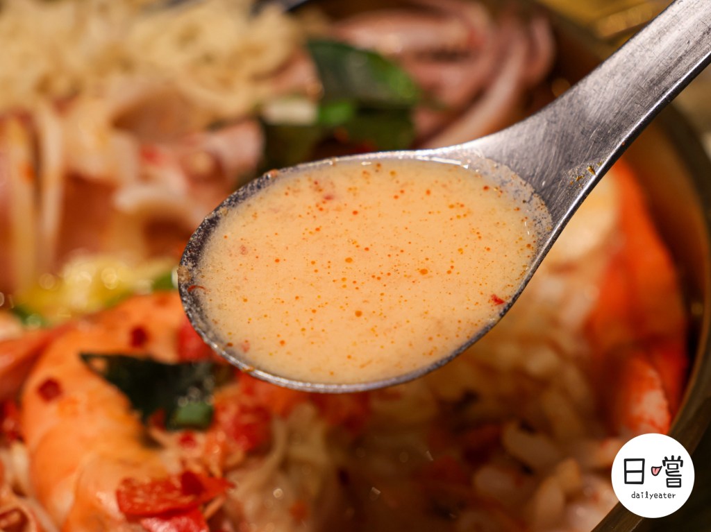 這鍋一上桌其實氣味就很明顯,是那種很標準的冬蔭功味道,酸香先出來,後面才是辣跟香料味。湯頭偏濃,不是清清淡淡那種,喝起來有厚度,也喝得到椰奶把辣度稍微拉圓。